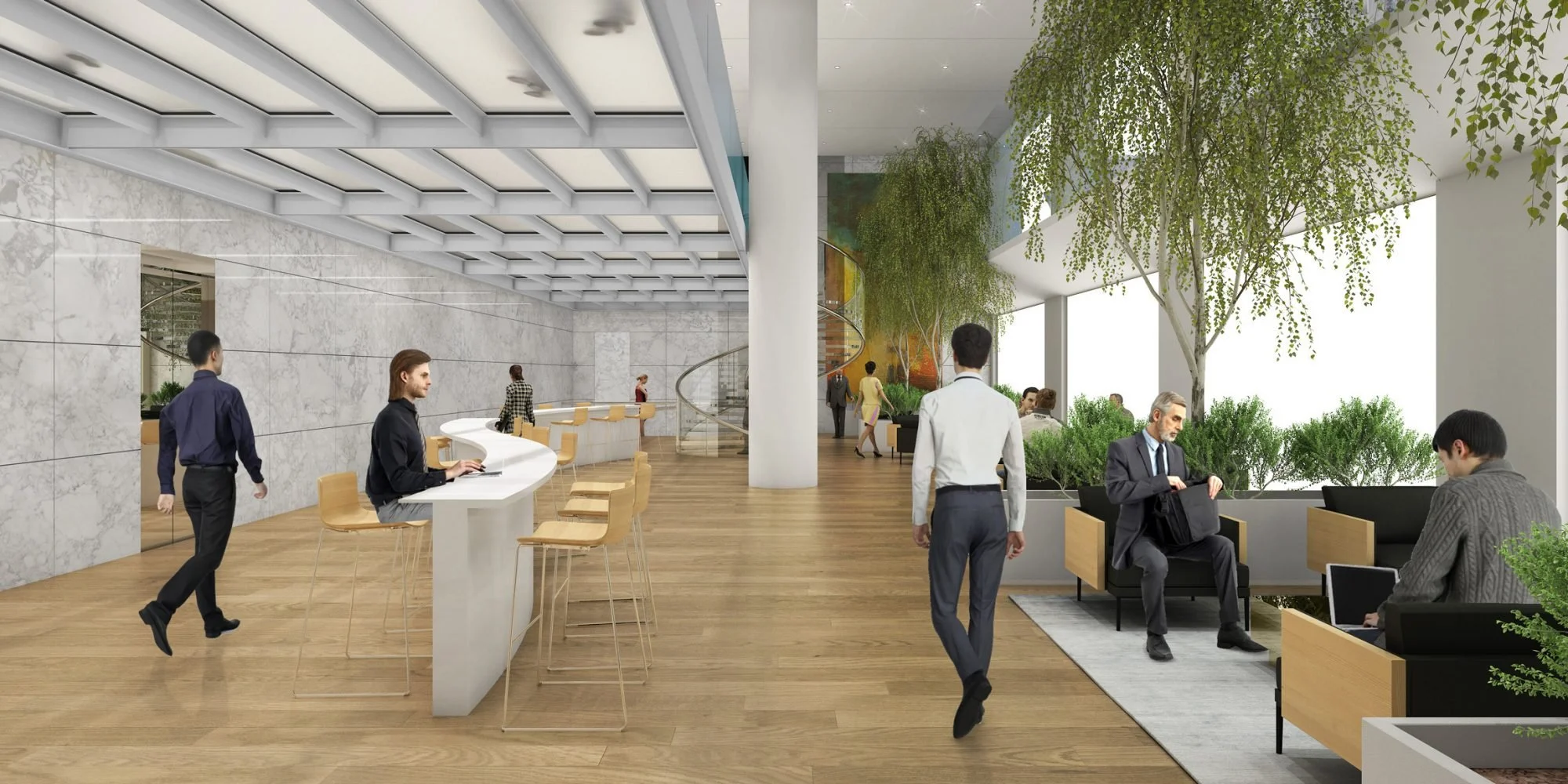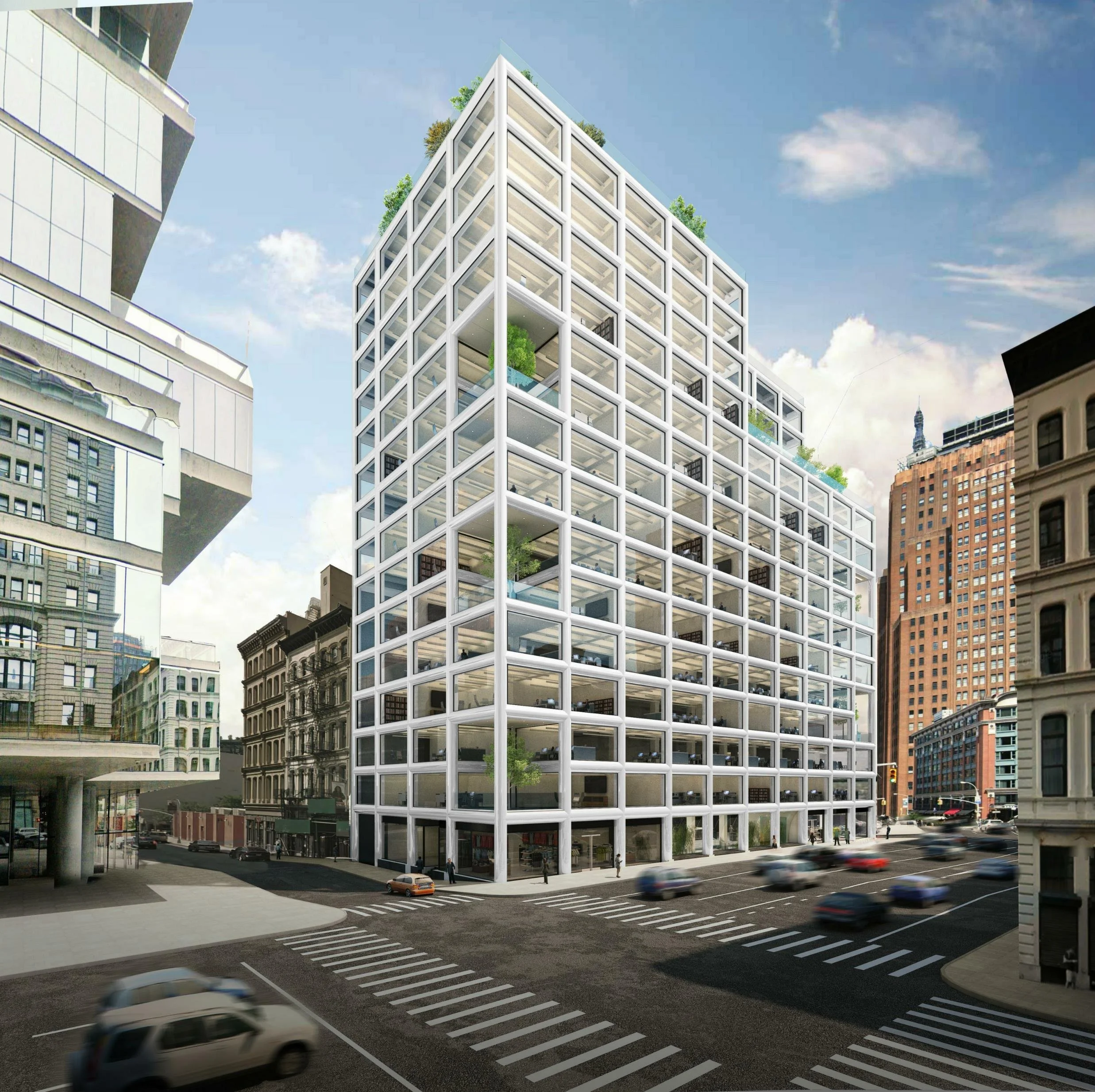 Terraces have been added at various levels, in coordination with the client’s marketing team, to create exterior amenity spaces that add value to tenant floors. The placement of these terraces considers potential workplace configurations, views, and the overall massing of the building.